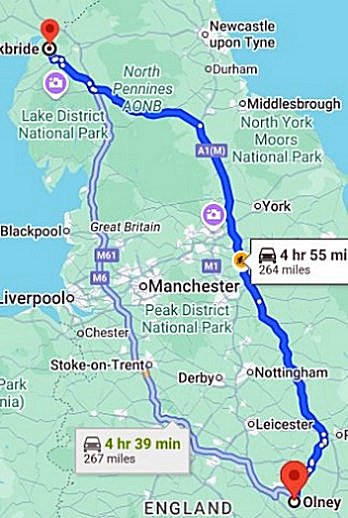 Travelled from Olney to Kirkbride on