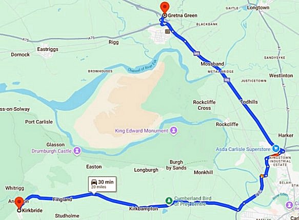 to Gretna Green, Scotland - 20 miles - |